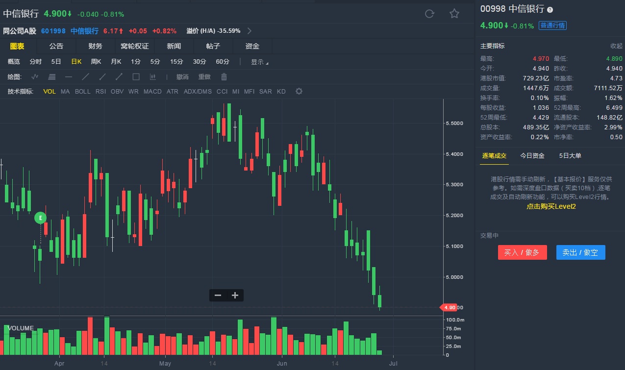 截至6月27日10:42,中信银行跌0.81%,报4.9港元。
