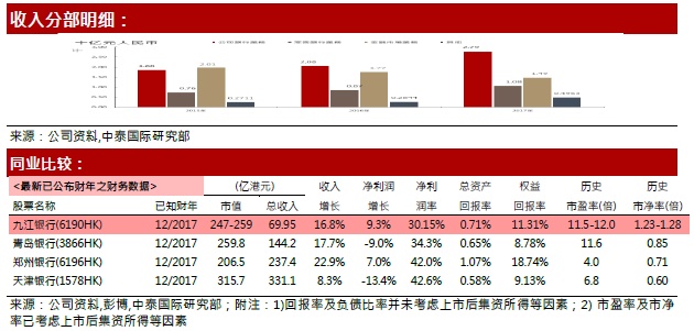 市场机遇良好,占有率及覆盖率高,看好区域性发展。受益于中国政府政策支持和经济增长的优势,江西省银行业发展较快。2017年,江西省所有银行业金融机构的存款总额及贷款总额分别上升11.8%及18.6%,两项增速在中国所有省份中分别位列第二和第三。九江银行在江西银行业的比重一直上升,2015至2017年,九江银行人民币存款总额与贷款总额的年复合增长率分别为15.8%及19.5%,我们认为九江银行未来的市场环境良好,可把握江西省持续经济增长带来的优势。此外,九江银行拥有广泛的业务网络,截至2017年12月31日,公司97家营业网点位于江西省各县,在江西省县域的覆盖率高达88%,在江西省银行业市场中有较高的市场占有率。