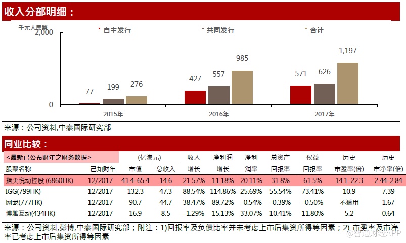 经营业绩方面,2017年所有营运中的游戏的整体转换率为5.9%,比行业平均水平的3.3%为高。过去三年,月均付费用户分别为12.2万、27.5万和25.5万户;平均每个付费用户的月均消费额持续改善,分别为188元、298元和395元人民币;总收益分别为2.8亿元、9.8亿元和12亿元人民币;毛利分别为1.45亿、5.92亿和7.24亿元人民币;毛利率分别为52.7%、60.2%和60.5%,2015年至2017年毛利率提升主要因自主发行游戏的收益增加。销售开支过去三年与业务增长成正比,分别为0.86亿、3.4亿和3.9亿元人民币,主要由于推广活动增加以吸纳及维持用户。