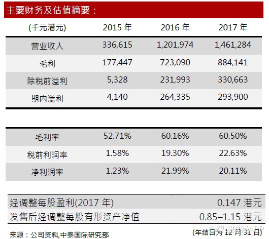 估值方面,按全球公开发售20亿的股本计算,对应公司市值为41.4-65.4亿港元,相比港股同行较低;对应17年市盈率为14.1-22.3之间,高于行业平均;发售后市净率为2.44-2.84,低于行业平均水平。盈利能力方面,17年的ROE,ROA分别为61.5%和31.8%,高于行业平均水平。综合公司在行业地位,业绩情况与估值水平,中泰国际给予其60分,评级为“中性”。