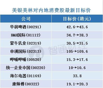 智通财经APP整理,美银美林对内地消费股最新目标价如下: