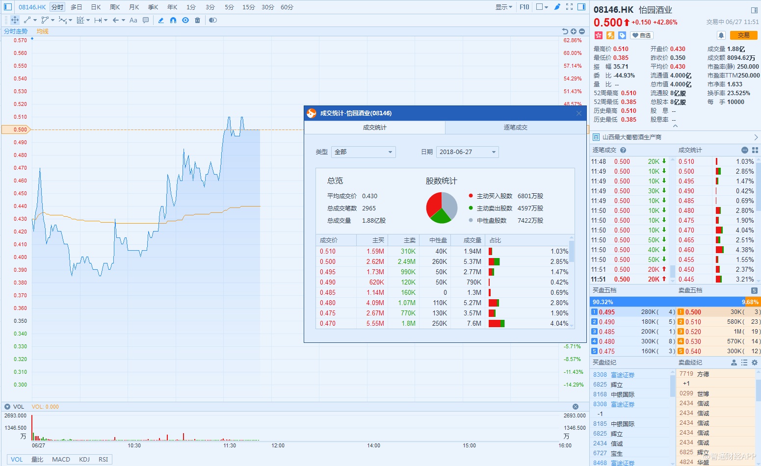 从单个走势来看,怡园酒业比较强势,高开20%,5分钟后冲高到30%后急速回落到10%的涨幅,大约盘整了40多分钟开始稳步上攻。从盘面来看,早盘回撤应该是主力蓄意打压,因为昨天暗盘仅仅辉立交易场就成交了1280万元,比集合竞价的成交金额1158万还要多,主力已经控制了相当部分的筹码。