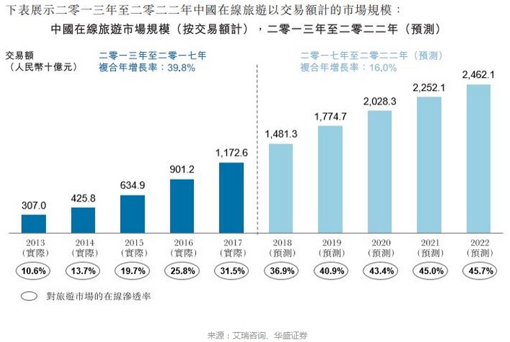 中国的在线旅游市场规模庞大,且目前正处于快速发展阶段。按总交易额计,中国在线旅游市场规模从2013年的3070亿元人民币增长到2017年的约1.17万亿元人民币,期间的符合年增速高达39.8%。预计2022年该市场规模将增长至约2.46万亿元人民币。多年来,中国旅游市场的线上渗透率不断提升,但相比美国等发达国家仍有差距,因此预计未来还有不少增长空间。
