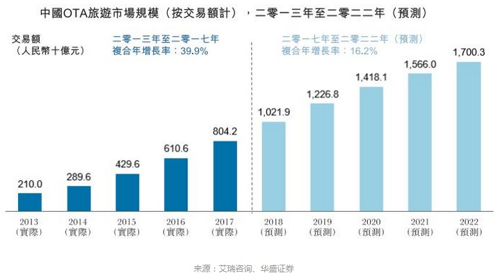 中国的在线旅游预定主要通过OTA(Online Travel Agency,在线旅行社)完成。过去五年中,中国的OTA市场规模也不断扩大,2017年达近8042亿元人民币,预计2022年,该市场规模将增长至近1.7万亿元人民币。同程艺龙所在行业的向好发展有望助力公司的未来发展。