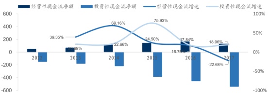 而在PPP模式下,环保上市公司投资驱动的特点越发明显,因此导致业绩快速增长,高度依赖投资性现金流流出的快速增长。