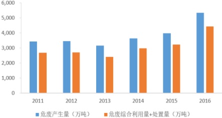 近年来危废产量逐年上升,虽然危废处置规模也在扩大,但供需缺口要远比数据显示的严峻。根据国家统计局数据,2016年我国共产生危险废物5347万吨,较上年同期增长34.49%;但2016年危废处置缺口达到917万吨,由于危废产生量是通过企业申报数据统计的,往往较实际情况要低的多。此外,由于危废处置实际产能也要低于经营许可证产能,危废处置实际缺口要远高于统计水准。