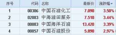 智通财经APP获悉,国际原油大涨,石油股再度走强。截至9时40分,中石化(00386)涨3.50%,报价7.09港元;中海油服(02283)涨3.44%,报价7.51港元;中海油(00883)涨3.39%,报价13.42港元。