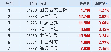 智通财经APP获悉,港股及A股券商板块集体暴动,指数直线拉升。截至10时31分,国泰君安(01788)涨4.27%,报价1.71港元;华泰证券(06886)涨3.92%,报价12.74港元;广发证券(01776)涨3.60%,报价11.50港元。