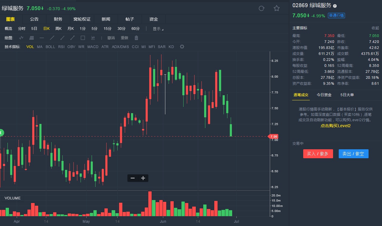 截至6月28日13:31,绿城服务跌4.99%,报7.05港元。