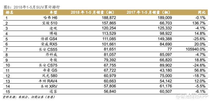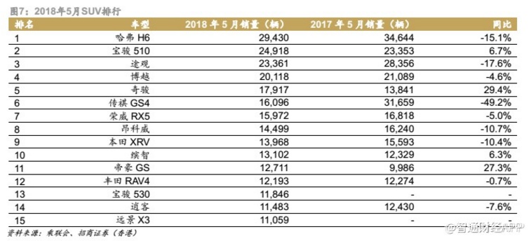 5)广汽集团的传祺GS4排名第五,新旧车型切换使其前五月销量同比下跌26%,但新款仅调整内外饰,对动力系统等没有升级,长远看在紧凑型SUV市场仍面较大竞争压力,成长的持续性仍面临考验。