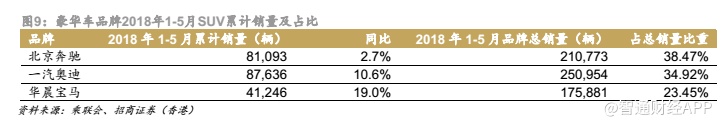 前五月中国SUV销量呈现V型走势,根据中汽协数据,1-5月销量增长率分别为22.9%/-3.1%/10.7%/18.3%/6.5%,1-5月累计销售422.7万辆,同比增长11.7%。因2017年一季度行业高销量、高库存产生了同比高基数,一季度SUV增速下滑曾引发市场担忧,4月SUV恢复强劲增长缓解市场悲观情绪。