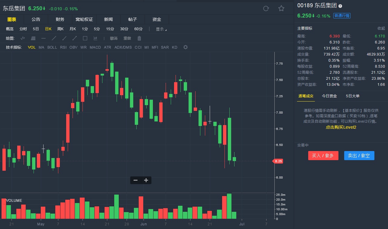 截至6月28日13:56,东岳集团跌0.16%,报6.25港元。