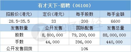 智通财经APP获悉,6月28日,国内知名精英职业发展平台猎聘网母企有才天下(06100)配股结束。本次配股招股价区间为28.5-35.5港元,最终定价33港元,每手6600港元。