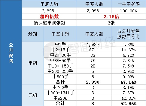 其中,公开配售申购人数2998,一手中签率100%,超购倍数2.18倍。