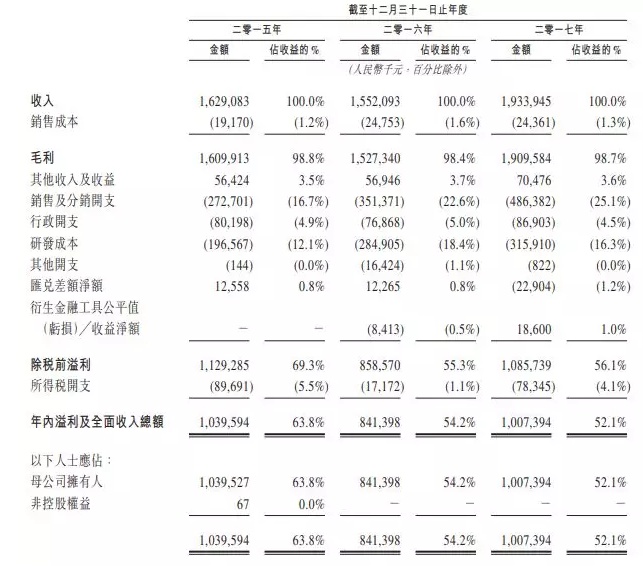 财务情况方面,2015年、2016年和2017年多益网络的收入约为人民币16.29亿、15.52亿和19.34亿,毛利率均保持在98%以上;其中年内溢利及全面收入总额分别约为人民币10.40亿、8.41亿和10.07亿。