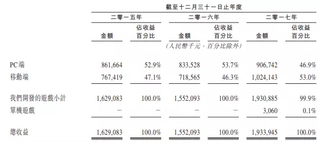 在收入方面,2015年、2016年和2017年神武端游系列的收入约为人民币7.49亿、7.29亿和7.74亿,分别占同期收入的46%,47%和40%。移动端方面,神武手游的收入约为人民币7.6亿、6.99亿和9.80亿,分别占同期收入的46.7%,45%和50.7%。