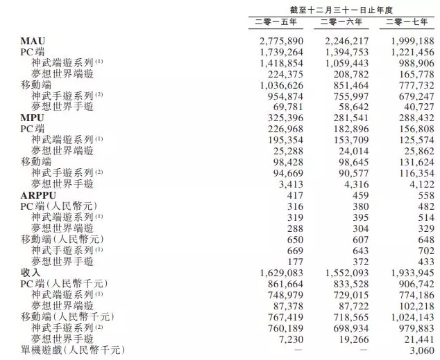 招股书中显示,2017年神武3端游系列及神武手游系列的MAU数分别约为98.9万和67.9万,其中MPU约为12.6万和11.6万;此外,梦想世界端游的MAU为16.6万、手游MAU为4万。
