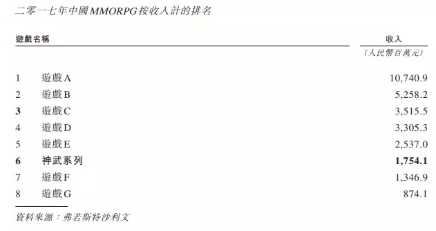 资料显示,在2017年中国MMORPG按收入计的排名榜单中,神武系列以约人民币17.54亿位列第六。多益网络在招股书中提到,由于多益会定期增强游戏,因此它们部分游戏的生命周期较网游的行业平均生命周期12个月及MMORPG游戏的行业平均生命周期18至24个月更长。