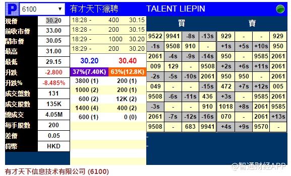 智通财经APP获悉,猎聘网母企有才天下(06100)将于明日挂牌,上市前夕,据辉立交易场资料显示,有才天下猎聘暗盘开市报30.05元,较招股价33元,跌2.95元,收报30.2元,较招股价跌8.485%,每手200股,不计手续费,每手亏560元。