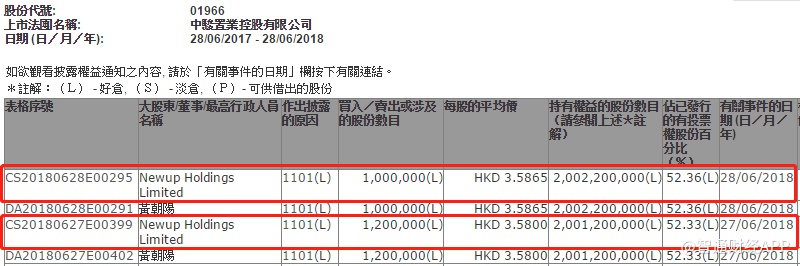 智通财经APP获悉,香港联交所股权变动资料显示,中骏置业(01966)于6月27日及28日获Newup Holdings Ltd合共增持220万股,每股作价分别为3.58和3.59元,总值788.6万元,最新持股量增至52.36%。