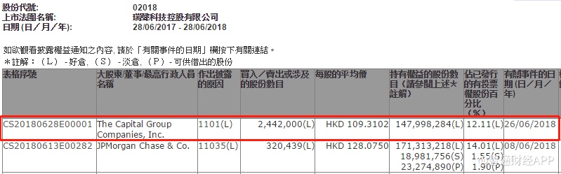 智通财经APP获悉,香港联交所股权变动资料显示,瑞声科技(02018)于6月26日获The Capital Group Companies, Inc.增持244万股,每股作价109.3元,总值约2.67亿元,最新持股量增至12.11%。