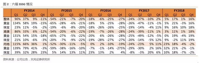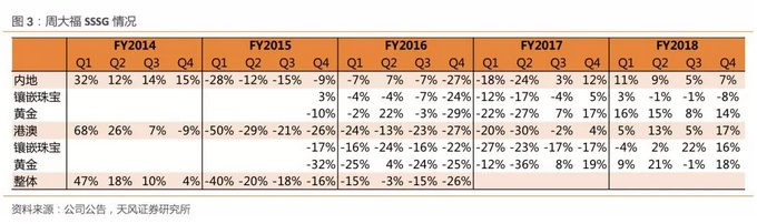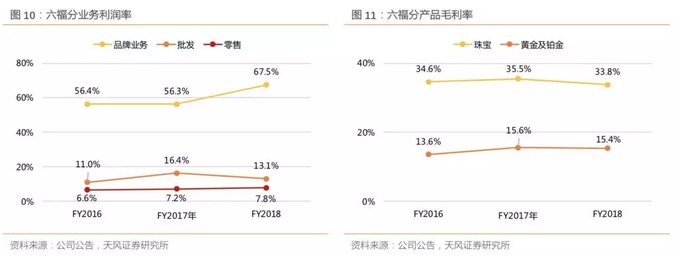 预计公司三四线城市的加速布局,将进一步享受由消费升级带来的巨大市场。但目前内地三四线珠宝市场呈现强竞争局面,公司面临香港和大陆的多家珠宝商对手,且各品牌产品及名字之间差异化较小,未来市场份额扩张或将承压。FY18三线以下同店销售增长3%,下半财年因公司不愿过多降价压低毛利率,促销力度不及同行,销售较上半财年同店销售增长20%有所放缓。
