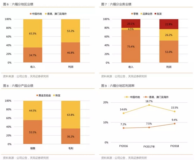 六福以其中高端轻奢定位和高性价比产品瞄准内地中产阶级,正迎合三四线城市消费升级趋势。配合产品定位,六福在内地门店扩张也以三四线城市为主,分销渠道以加盟店为主,自营店为辅。