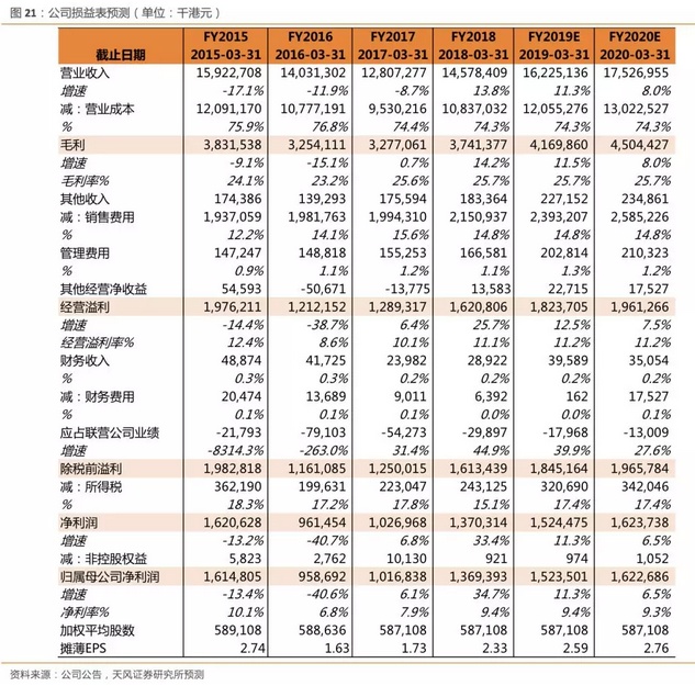 公司整体同店销售自连续三年下跌后首次同比转正至9.2%,港澳同店销售增长9.4%,内地同店销售增长4.6%。香港仍是公司最主要收入来源,收入同比增7%至67亿港元,占比65%。内地收入同比增23%至51亿港元,占比35%,由于以高利润率的品牌模式为主,利润占比达47%。全年净增店137间,其中134间位于内地。FY19内地店铺目标为净增长不少于120间。同时公司欲大力发展电子商务业务,目标收入增长30%。截止2018年3月31日,公司拥有1642间店铺,其中1561间位于内地,58间位于港澳。
