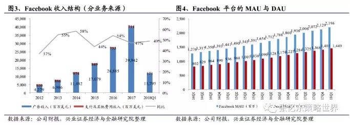 巨大社交流量提供广告高变现引擎。基于社交逐渐变成刚性需求以及Facebook的先发优势,公司积累了大量用户,在全球网民35亿的情况下,达到了22亿的MAU(2018Q1),在社交存量市场筑起坚实壁垒。叠加公司推出信息流的先发优势(2011年推出,2012年正式上线),高速推动了Facebook的经营业绩。