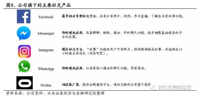 五大社交产品全方位布局生态圈。目前公司旗下有5大社交网络产品,分别为Facebook、Instagram、Messenger、WhatsApp及Oculus: