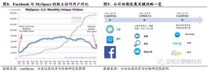 2008-2011年,Facebook从美国到全球:Facebook并不满足于美国市场,而意在成为全球的社交平台,公司的全球化战略布局随即全面铺开。2009年,Facebook全球独立访问用户首次超过了竞争对手MySpace,达到1.24亿。这段时间内,Facebook上线更多功能,并整合短信、email等聊天渠道,使好友聊天功能更强大,同时与Bing合作推出社交搜索功能。2011年,Facebook允许用户之间单一订阅对方公开动态,无需双向关注,用户关系结构更多元化,并将其聊天应用Messenger做成独立应用。另外,从广告收入的地区细分来看,公司逐步拓展北美以外地区广告业务。自2008年起,公司即着眼于辐射全球用户,拓展业务范围。