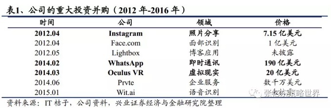 2012年公司以7.15亿美元收购Instagram,既使得用户分享形式趋于多元化,同时标志着公司从文字拓展到了图片时代,又遏制了竞争对手Snapchat在阅后即焚利基市场上的进攻。