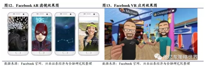 1)社交网络+AR:2017年Facebook发布基于手机摄像头的AR特效平台Camera Effects Platform,可绘制图像作为滤镜添加至Facebook相机,并根据相机的取景画面添加动态效果。而用户只需一部智能手机即可制作AR滤镜及分享AR体验。