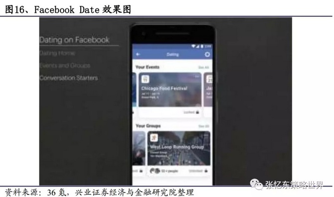 5)社交网络+约会:同年,Facebook宣布推出相亲婚恋应用Date,针对在Facebook上已建立弱联系的用户,以线下聚会方式形成强联系。Date用户可选择资料是否对特定的活动和聊天群开放,而对于在Facebook上标注“已婚”或者“恋爱中”的用户则无法使用该程序。消息公布当天,婚恋应用同行Match Group股价就暴跌23%,从侧面说明市场对拥有22亿月活用户的Facebook作为流量入口。