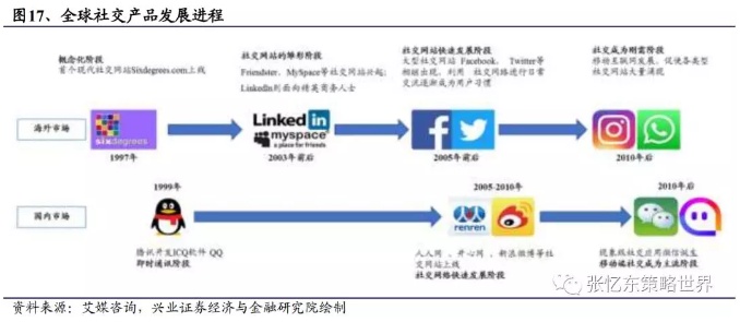 国内社交网络发展进程:1999年诞生的ICQ类软件腾讯QQ着眼于即时通讯领域,后来出现的提供私密好友圈动态分享的QQ空间,成为一时爆点。2005-2010年,人人网、开心网、新浪微博等社交网站上线,中国跟随海外进入了社交网络快速发展阶段。2010年后,现象及社交应用微信的诞生对人们早已习惯使用的QQ造成了一定冲击,标志着移动端社交成为主流阶段,陌陌等移动端社交APP出现。