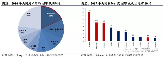 (三)区块链:社交行业包含大量原生数据、参与人数众多、信息保护成本较高,与区块链具有较高的契合性。Facebook任命副总裁马库斯带队研究区块链技术和数字加密货币,用于帮助Facebook对账户身份和加密数据进行验证,进一步提高用户隐私的安全性。更进一步来说,Facebook已拥有22亿用户,具备ICO的基础,创造去中心化的全球性货币或将成为下一时代的主题。