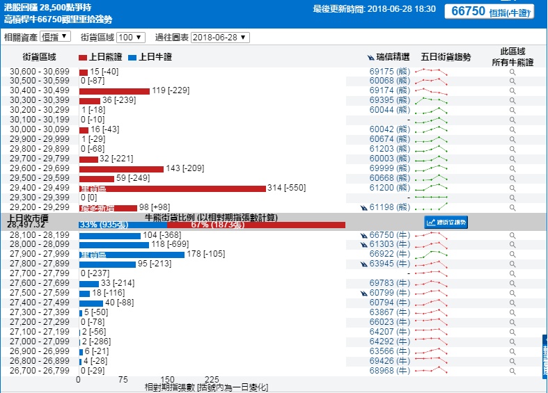 智通财经APP获悉,截至6月28日,恒指最新的牛熊街货比例为33:57。从瑞信恒指牛熊证街货分布图中得到的数据显示,熊证街货重货区在29400-29499区间,此区间最新的熊证数量为314张,比上一交易日减少550张,最多新增落在29200-29299区间,新增98张。牛证中重货区在27900-27999区间,该区间最新牛证数量为178张,比上一交易日减少105张;牛证各区间数量继续减少。