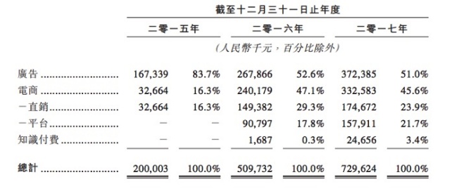 广告和电商是宝宝树的两大收入来源,2017年两者在总营收占比达96.6%,其中广告营收3.72亿元,在总营收中占比51%。电商营收3.33亿元,占比45.6%;知识付费是新拓展的业务,2017年占比3.4%。