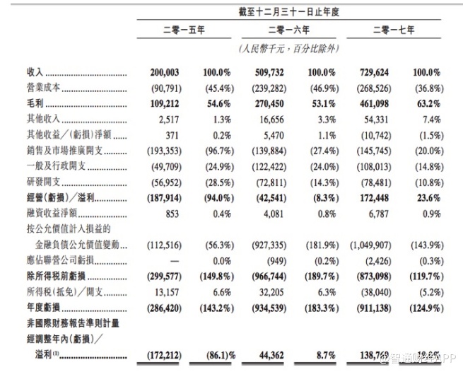 招股书显示,2015年至2017年期间,宝宝树营收分别为2亿元、5.09亿元、7.29亿元;毛利率分别为54.6%、53.1%、63.2%;年度亏损分别为2.86亿元、9.34亿元、9.11亿元;2015年经调整年内亏损1.72亿元,2016年盈利0.44亿元,2017年盈利1.38亿元。