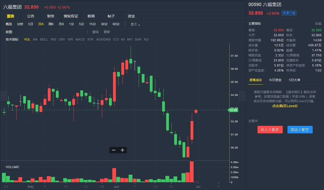 截至6月29日10:16,六福集团跌2.66%,报32.85港元。