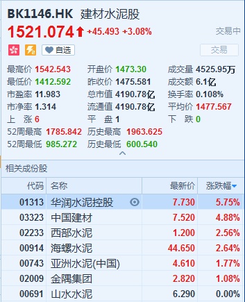 其中,华润水泥控股(01313)及中国建材(03323)分别涨5.75%、4.88%。