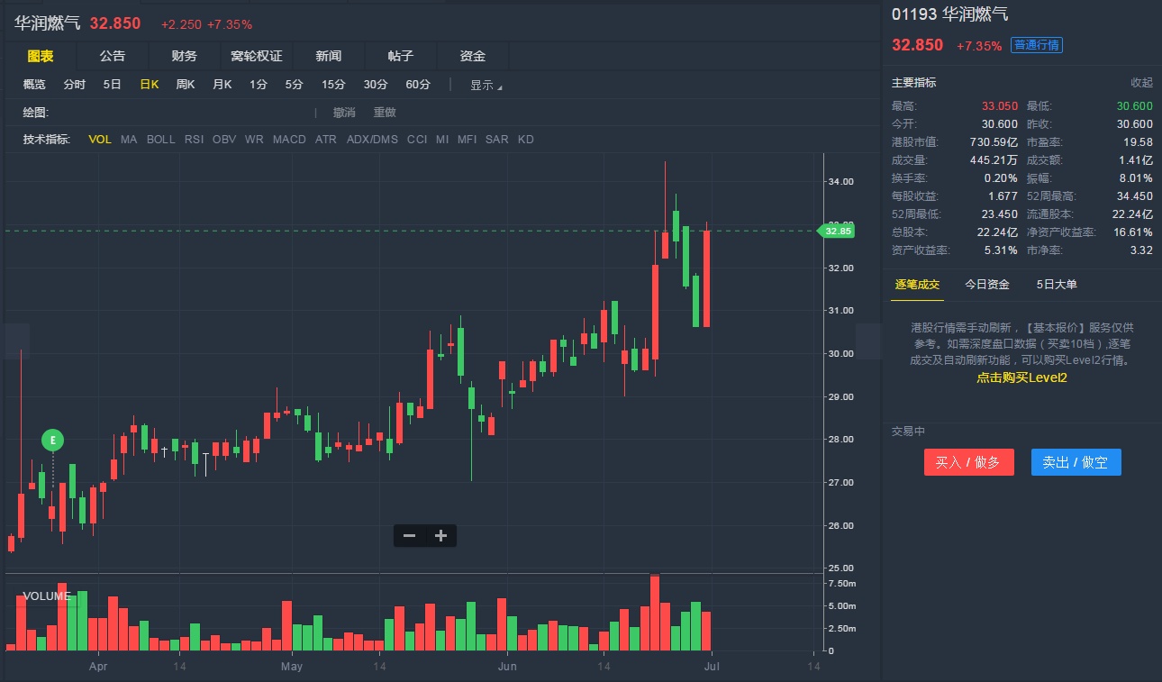 截至6月29日10:38,华润燃气涨7.35%,报32.85港元。