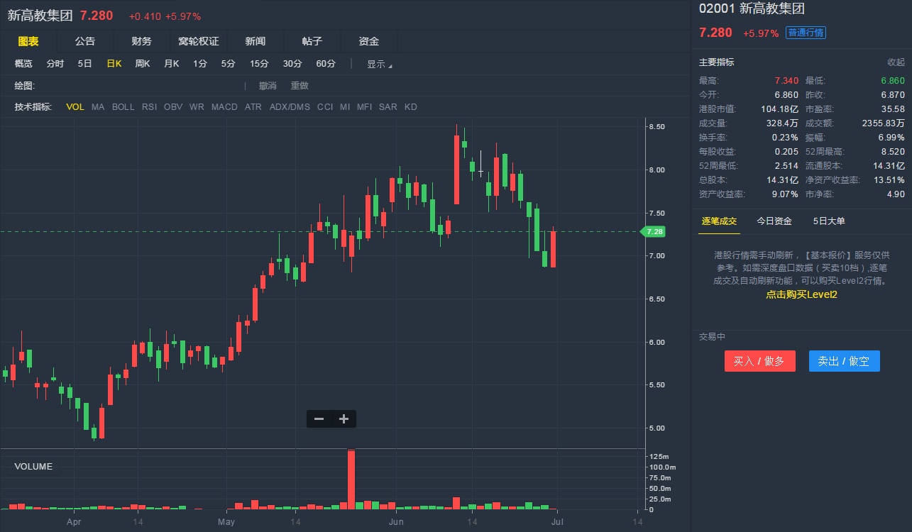 截至6月29日10:52,新高教涨5.97%,报7.28港元。