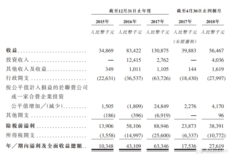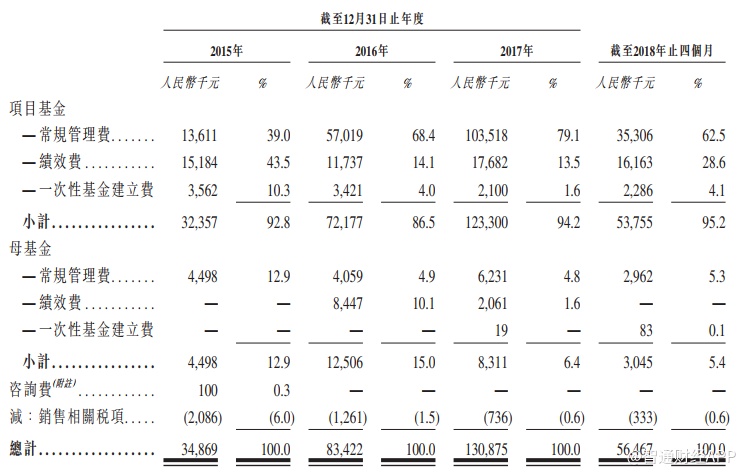 截至2017年12月31日至三个年度及2018年4月30日止四个月,公司固定管理费分别为1810万、6110万、10970万、3830万元人民币,分别占总收益约51.9%、73.3%、83.9%及67.7%。同期,绩效费用分别为人民币1520万、2020万、1970万及1620万元人民币,分别占总收益额约43.5%、24.2%、15.1%及28.6%。此外,公司还收取其基金一次性建立费,设计相关基金的设立和结构及投资者采购。