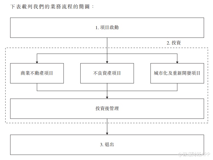 其基金主要投向商业不动产项目、不良资产项目以及城市化及重新开发项目。自公司2010年成立以来,所管理基金已投资合计25个大型投资项目,其中已完成及成功退出项目13个。项目基金期限通常介于15-48个月,母基金期限通常介于36-60个月。于最后实际可行日期,公司共管理项目基金12个,母基金6个,管理资金总额约44.11亿元人民币。于往绩记录开始之日(2015年1月1日),管理资产额约为6.79亿元人民币,复合年增长率70.7%。