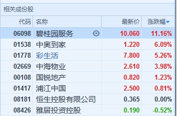 智通财经APP获悉,物业管理股集体反弹,截至11时04分,整个板块涨4.13%。碧桂园服务(06098)涨11.16%;中奥到家(01538)涨6.09%;彩生活(01778)涨5.26%;中海物业(02669)涨3.98%。