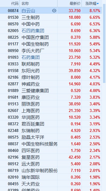 智通财经APP获悉,港股走强,医药股受捧。截至11时19分,白云山(00874)涨8.17%;中国中药(00570)、三生制药(01530)、石药集团(02005)涨超6%;中国医疗集团(08225)、中国生物制药(01177)、李氏大药厂(00950)、石药集团(01093)均涨超5%;联邦制药(03993)、东阳光药(01558)、神威药业(02887)等均涨超4%。