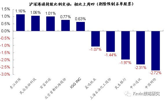 南下资金持股比例上,截至本周四的持股比例与上周四(6月21日)的数据相比较(但需要考虑T+2结算因素),东江环保的持股比例增加了1.16个百分点;民众金融科技和百富环球的持股比例分别增加1.06和1.01个百分点;首都机场、IGG等的持股比例也有不同程度的增加;与此相反,中国财险的持股比例降低了2.72个百分点,中兴通讯的持股比例降低2.31个百分点,民生银行、上海石化、晨鸣纸业等的持股比例也均有不同程度的降低。