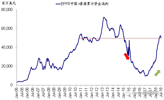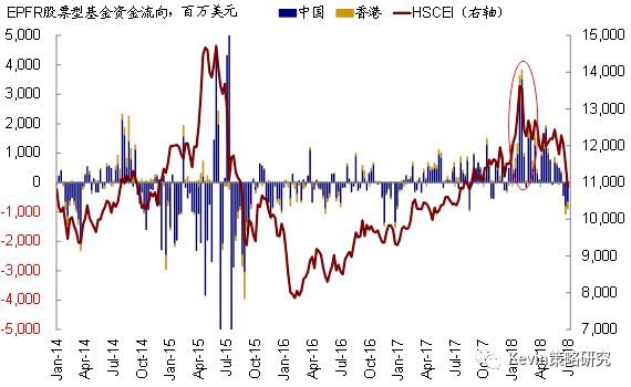 进一步剔除中国内地的基金后,我们发现,本周海外资金继续流出港股市场,但速度趋缓。在上文提到的追踪中国市场(包括A、H、红筹)基金中,EPFR统计范围内的中国内地基金流入4.6亿美元。因此,剔除上述内地基金后,本周流出香港市场(H、红筹、香港本地股)的海外资金规模为13.3亿美元,与上周流出19.1亿美元的情况相比,边际上略有改善。