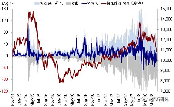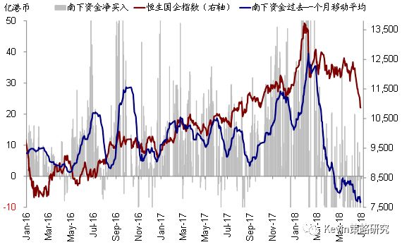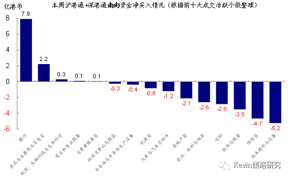 个股层面,根据十大成交活跃个股的资金流向情况统计来看,本周南下资金转为流入银行(建行,5.1亿港币;中行,3.5亿港币),不排除与派息临近的“抢权”有一定关系,同时也流入融创中国(4.8亿港币)、高鑫零售(2.2亿港币)等,但流出碧桂园(6.3亿港币)、瑞声科技(5.3亿港币)、中国平安(~3亿港币)等。